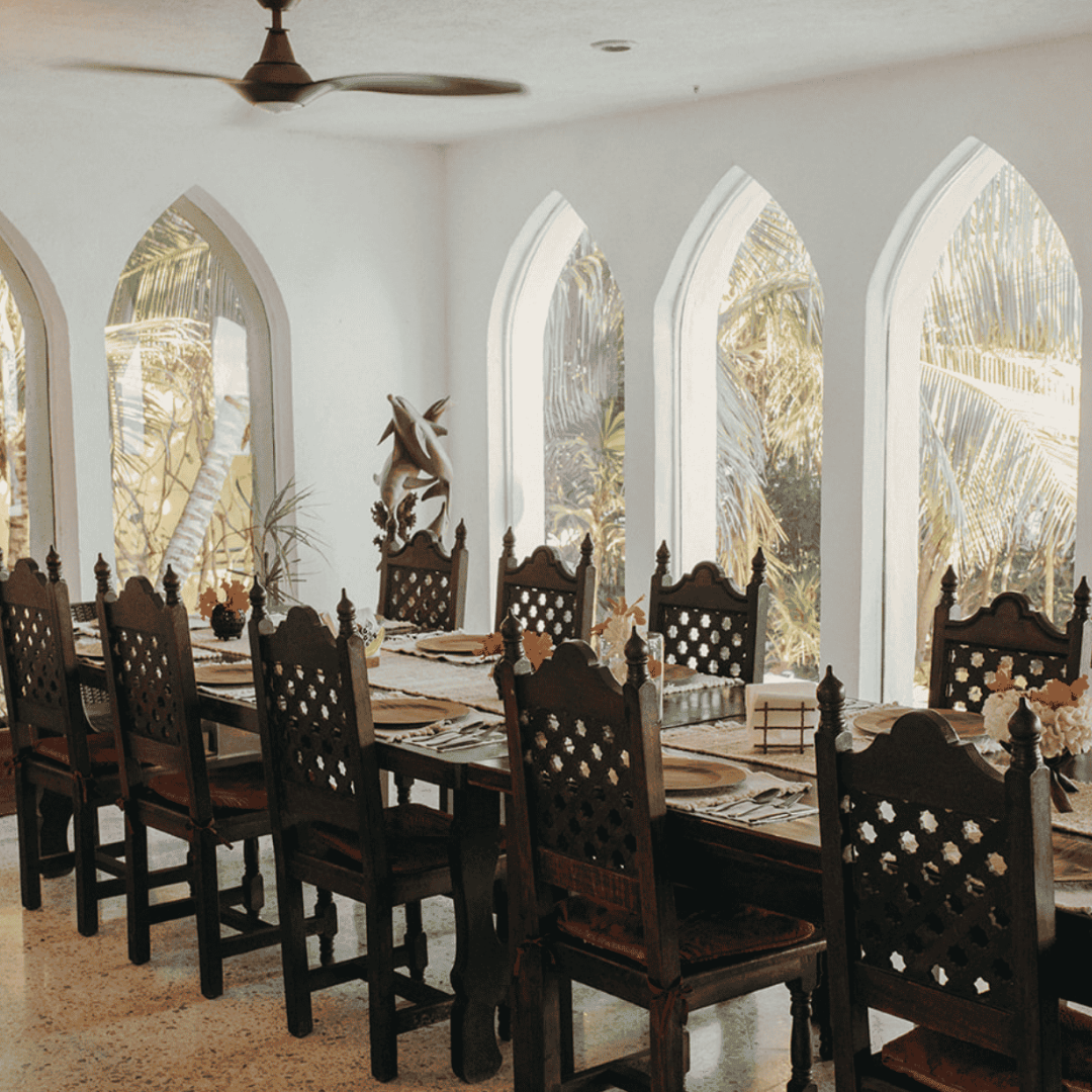 A dining room with a long wooden table, black chairs, and large arched windows showing palm trees outside.