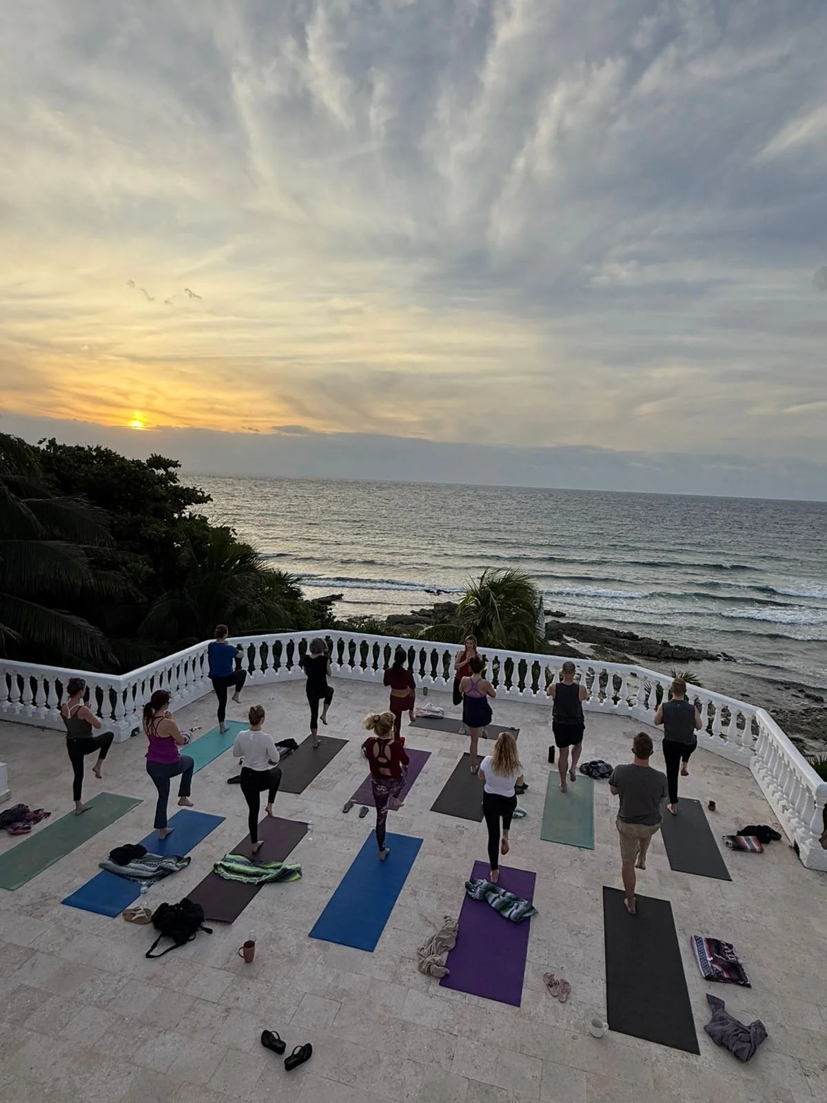 Group of people practicing yoga on a terrace overlooking the ocean during sunset.